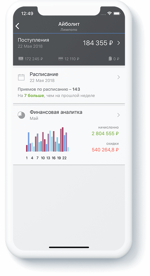 и показывает доходы, расходы, расписание врачей вреальном времени. Всё это ввашем смартфоне, в любой точке мира.