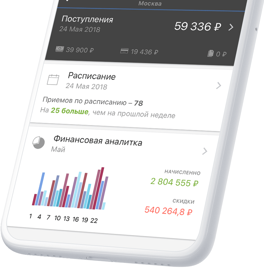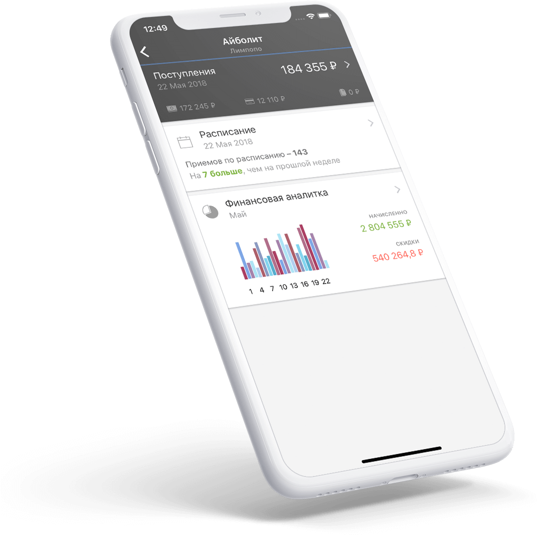 и показывает доходы, расходы, расписание врачей вреальном времени. Всё это ввашем смартфоне, в любой точке мира.